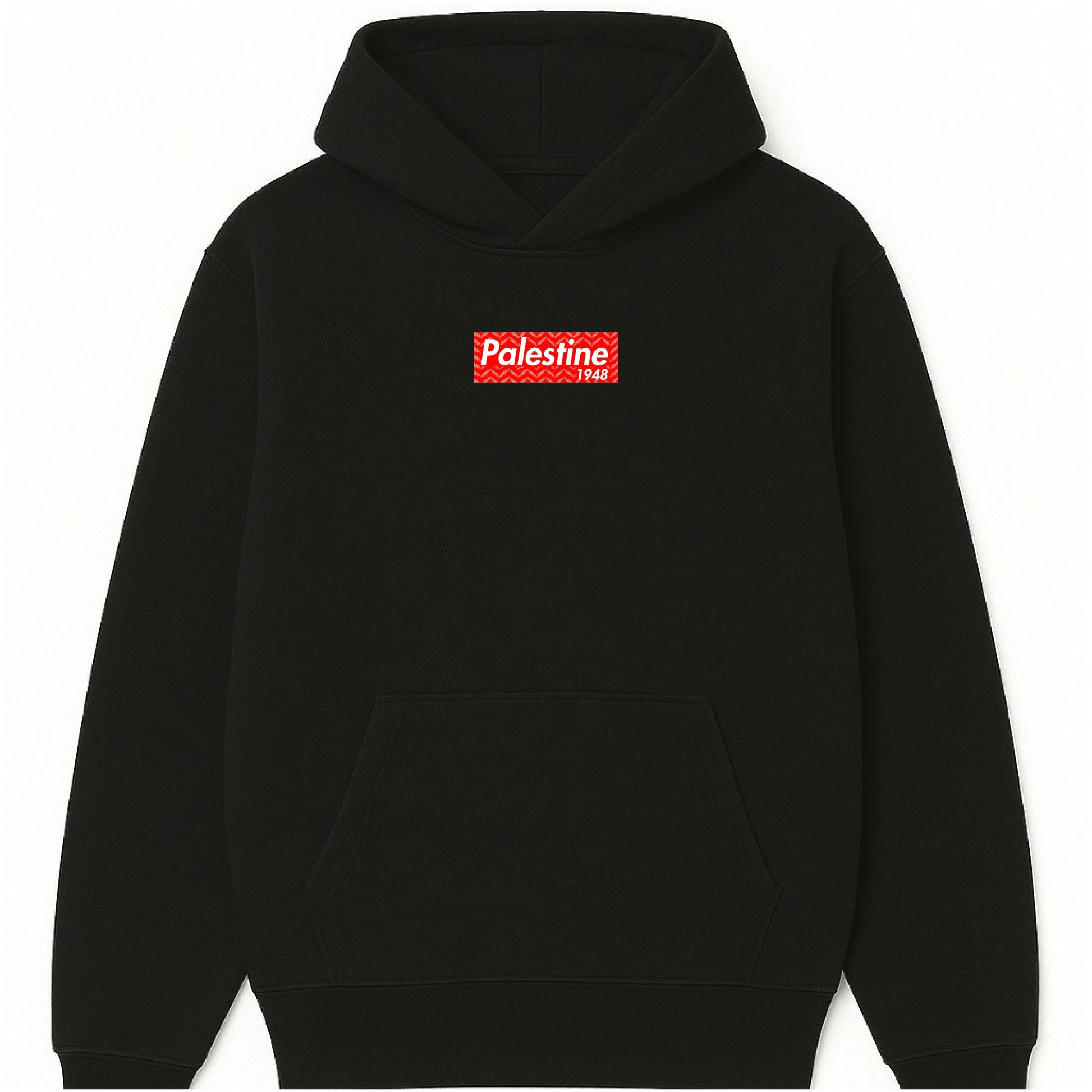 The front features the word “Palestine” framed within a bold red box, echoing traditional keffiyeh patterns, with 1948 marking a pivotal moment in history. On the back, coordinates of the West Bank - القدس (Al Quds, Jerusalem) root the design in place and belonging.