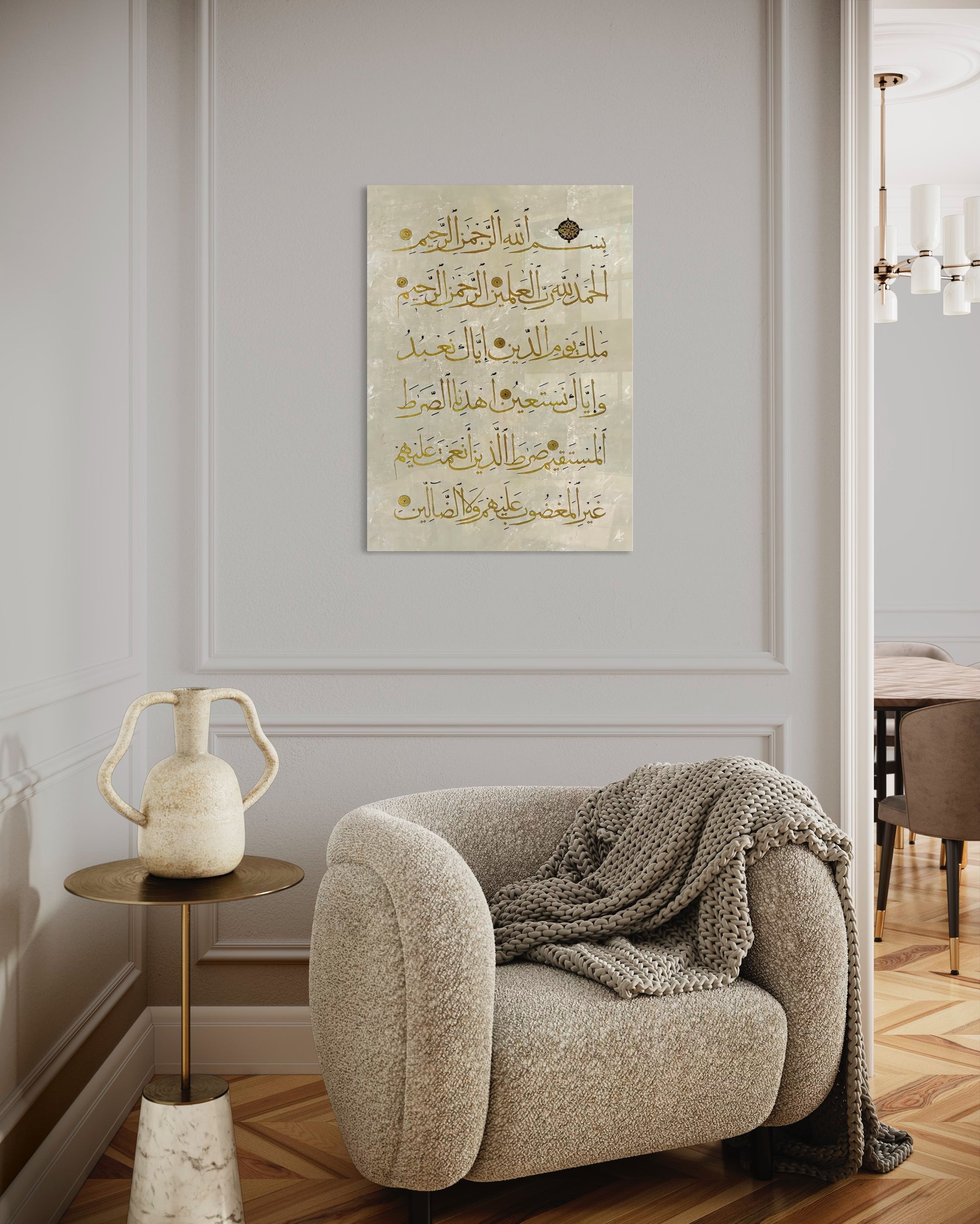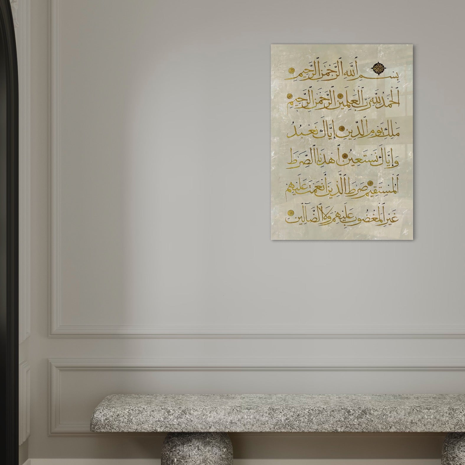 Title: Al-Fatiha (2) ‘The Opening’ - Islamic Glass Wall Art (Scriptured effect with a faded, rustic look).