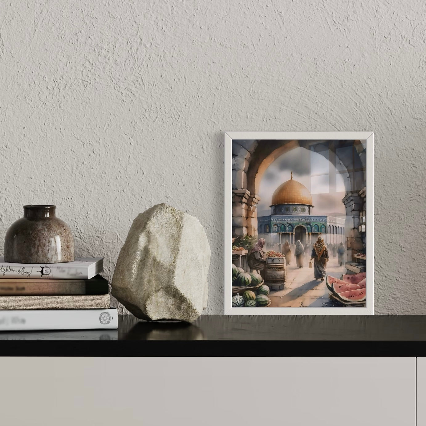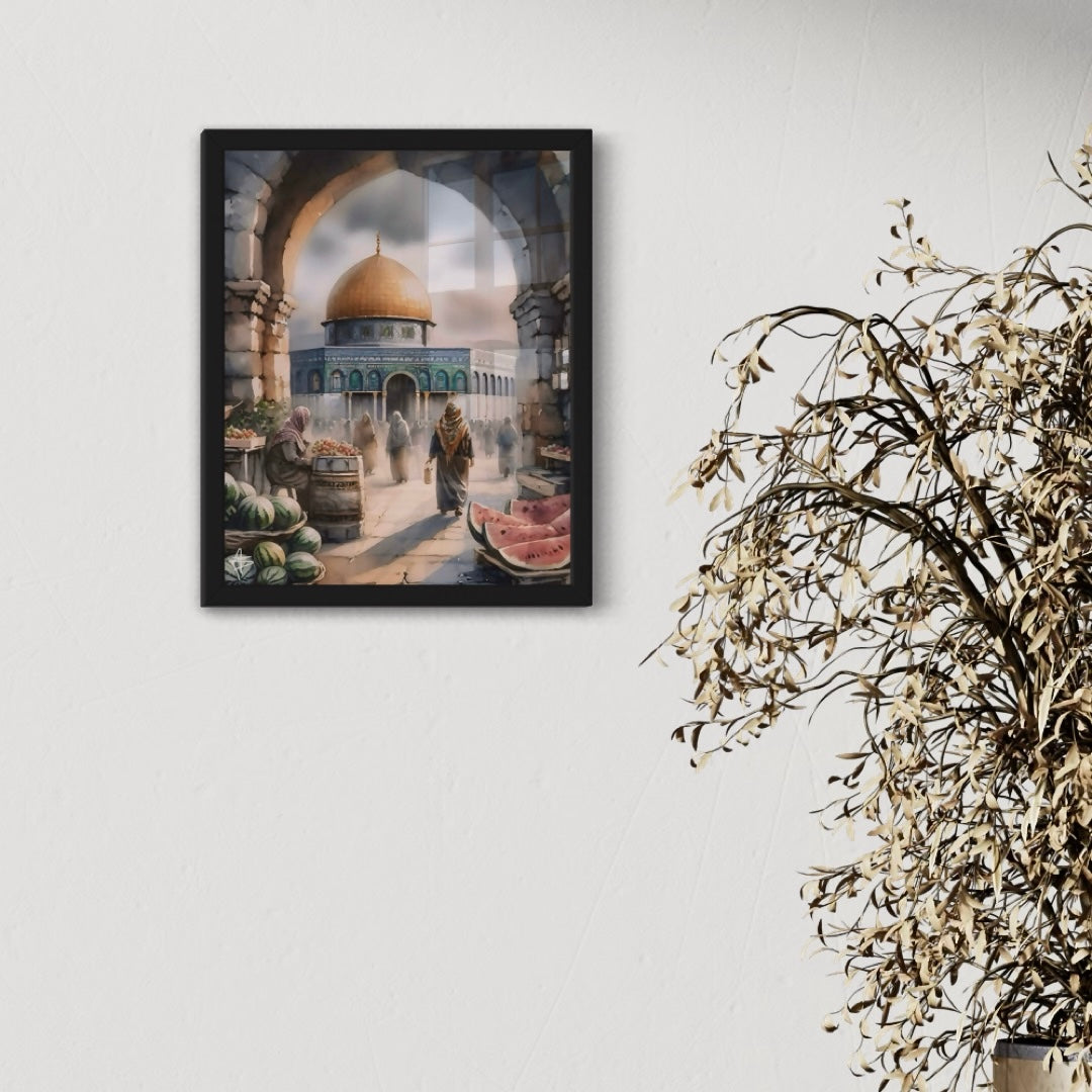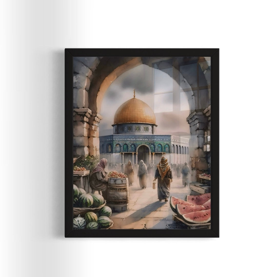Title:ย Al Quds Market | Watercolourย Framed Islamic Art Print.