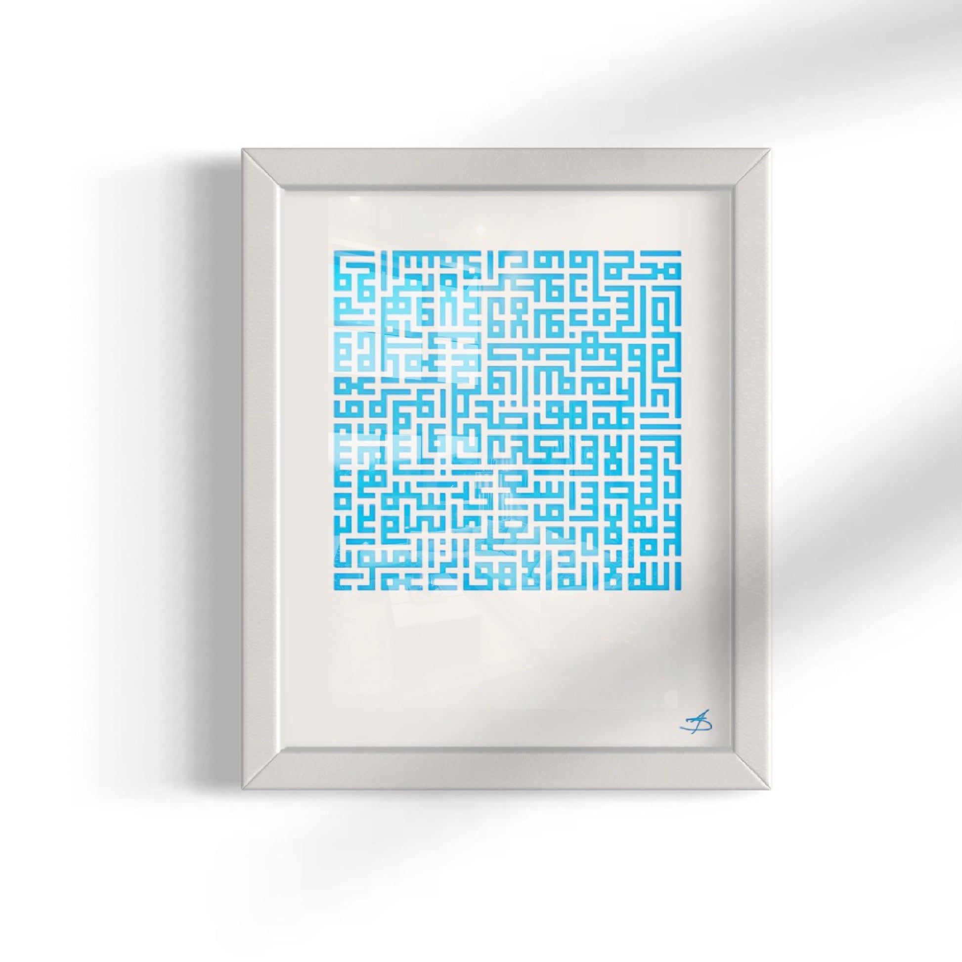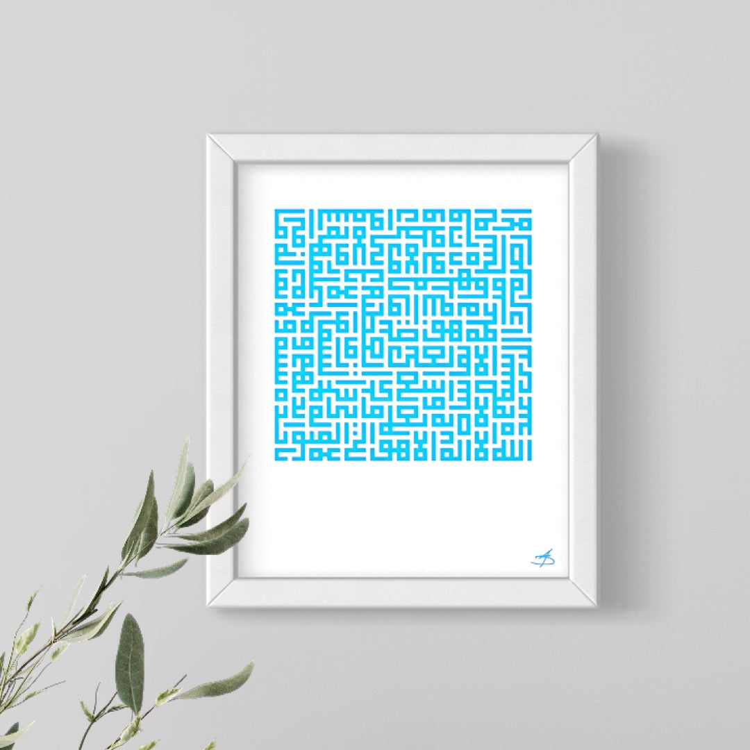 Title: Ayatul Kursi - Framed Kufic Square Calligraphy - Blue On White