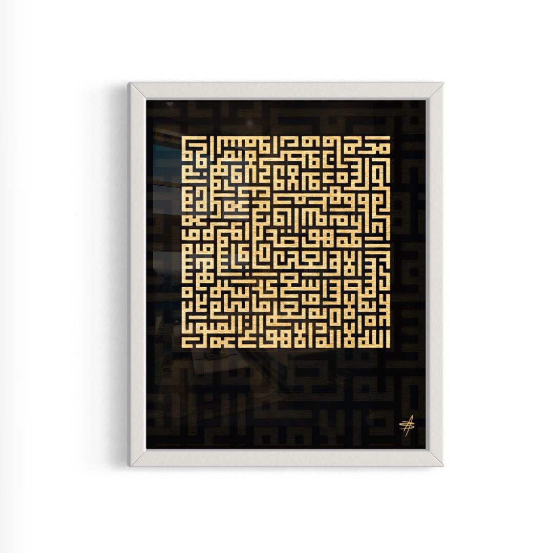 Ayatul Kursi - Framed Kufic Square Calligraphy - Gold/Black Abstract