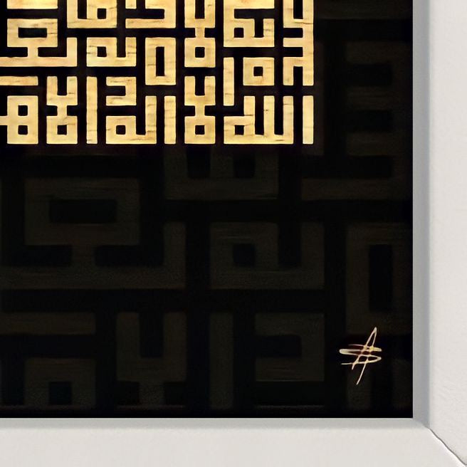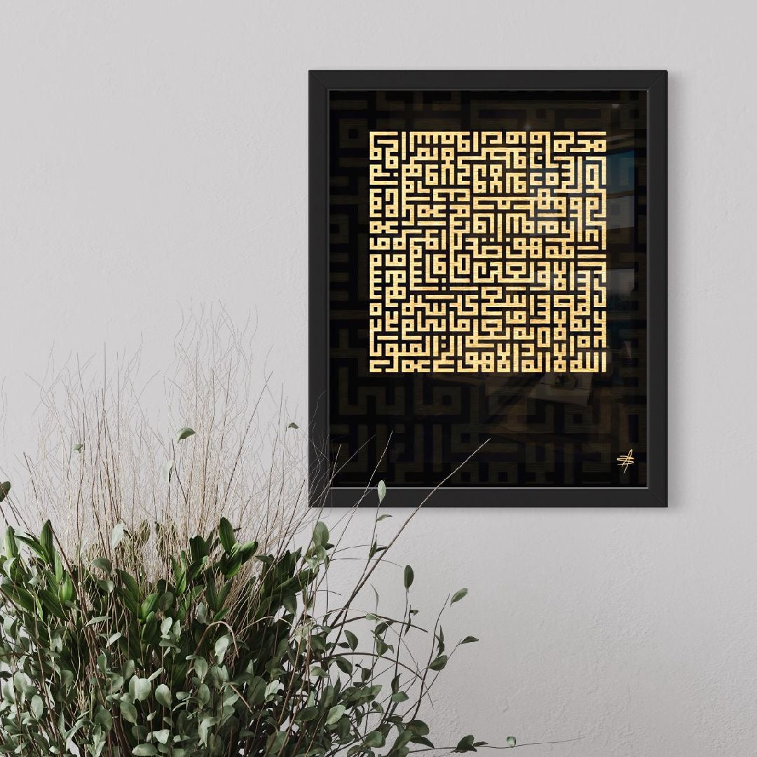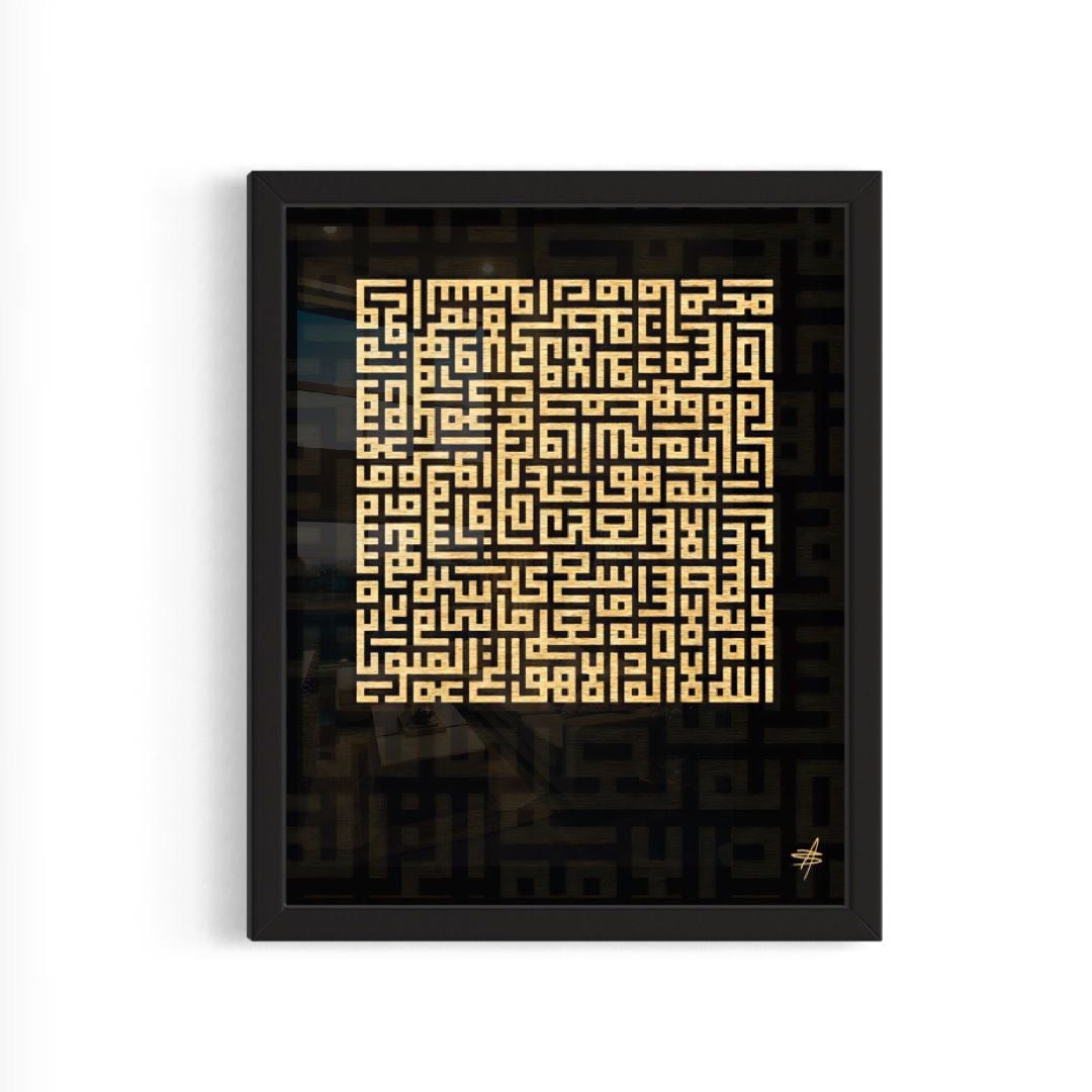 Title: Ayatul Kursi - Framed Kufic Square Calligraphy - Gold/Black Abstract