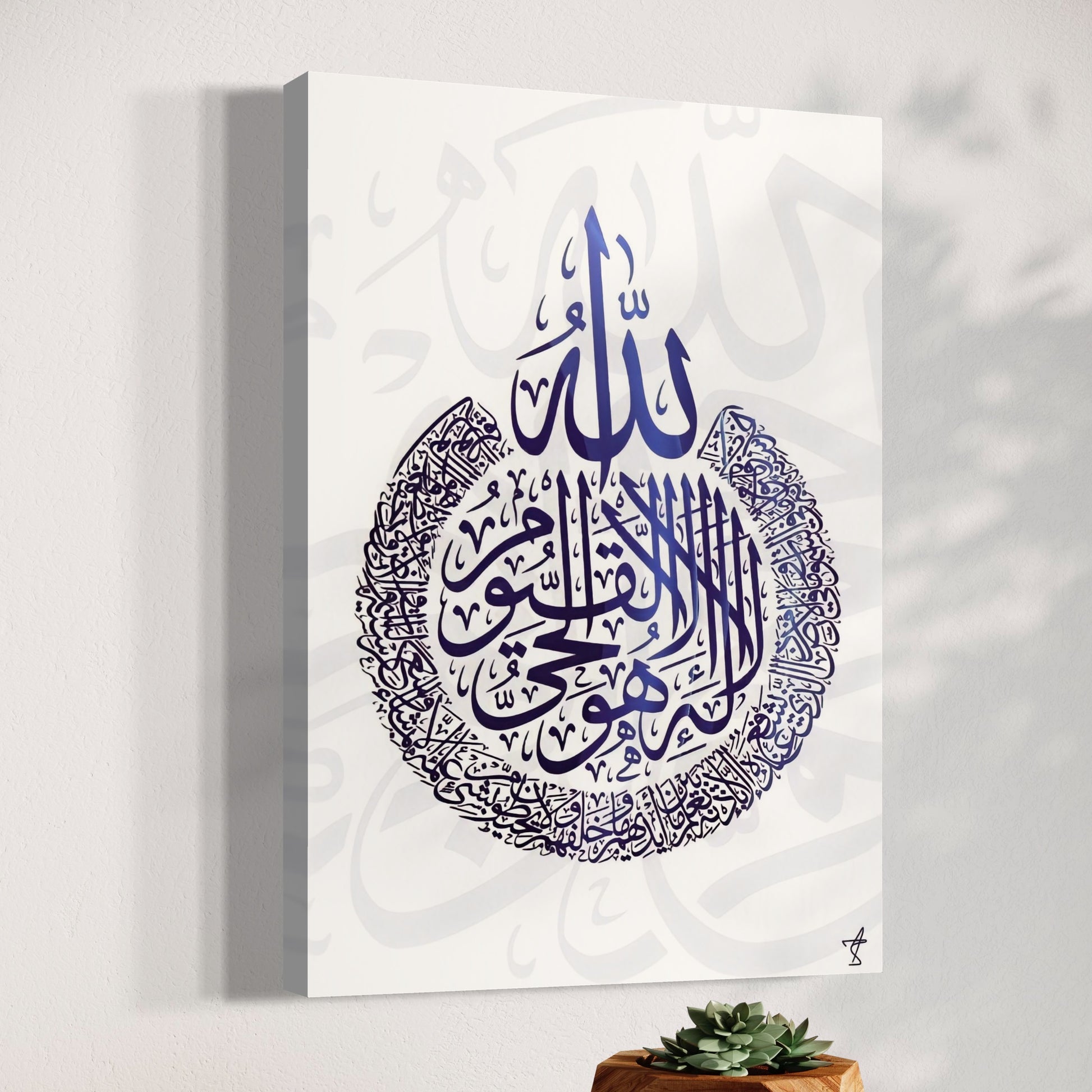 Ayatul Kursi - The Throne - Arabic Calligraphy Blue On White Abstract - Canvas Print