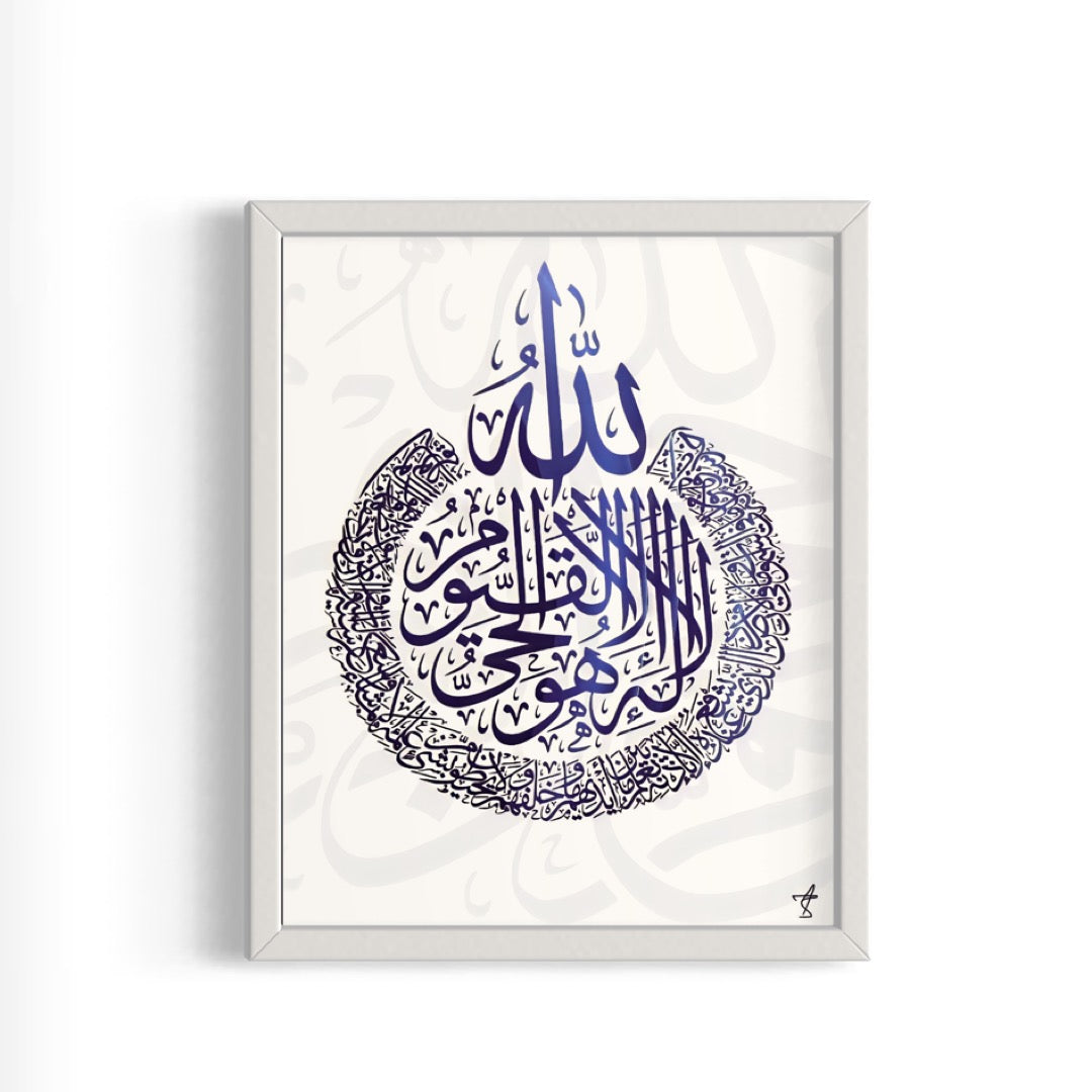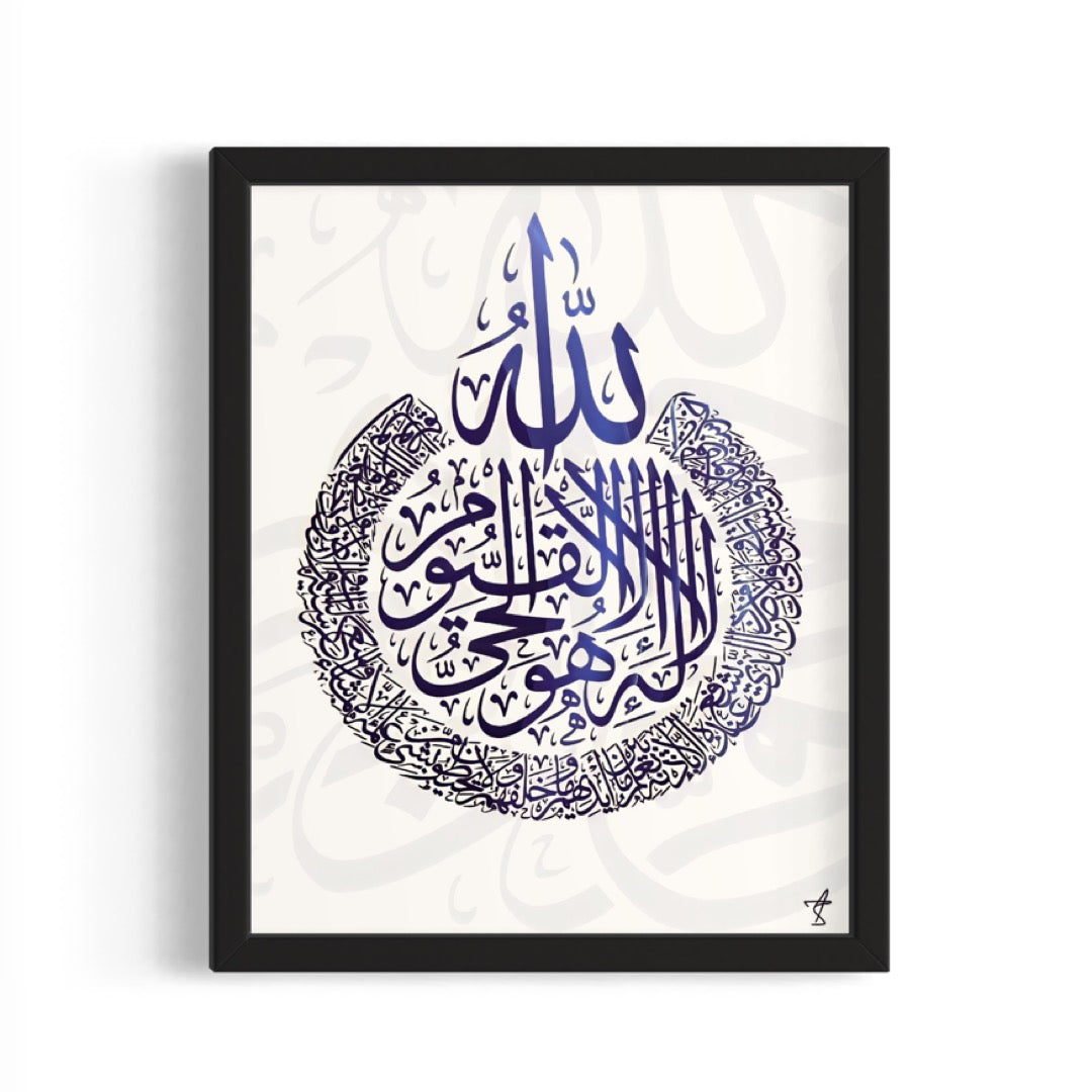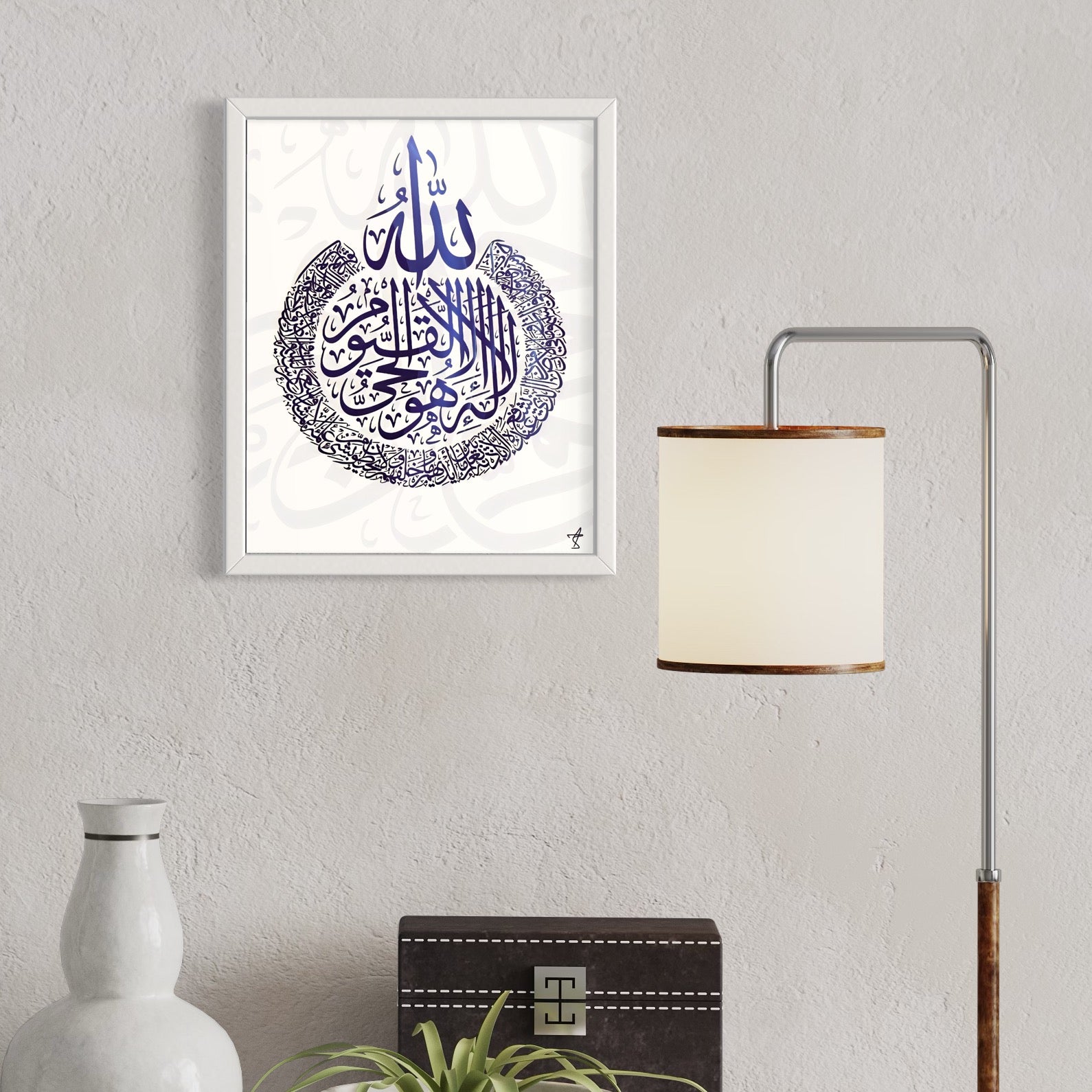 Ayatul Kursi - The Throne - Arabic Calligraphy Blue On White Framed Print