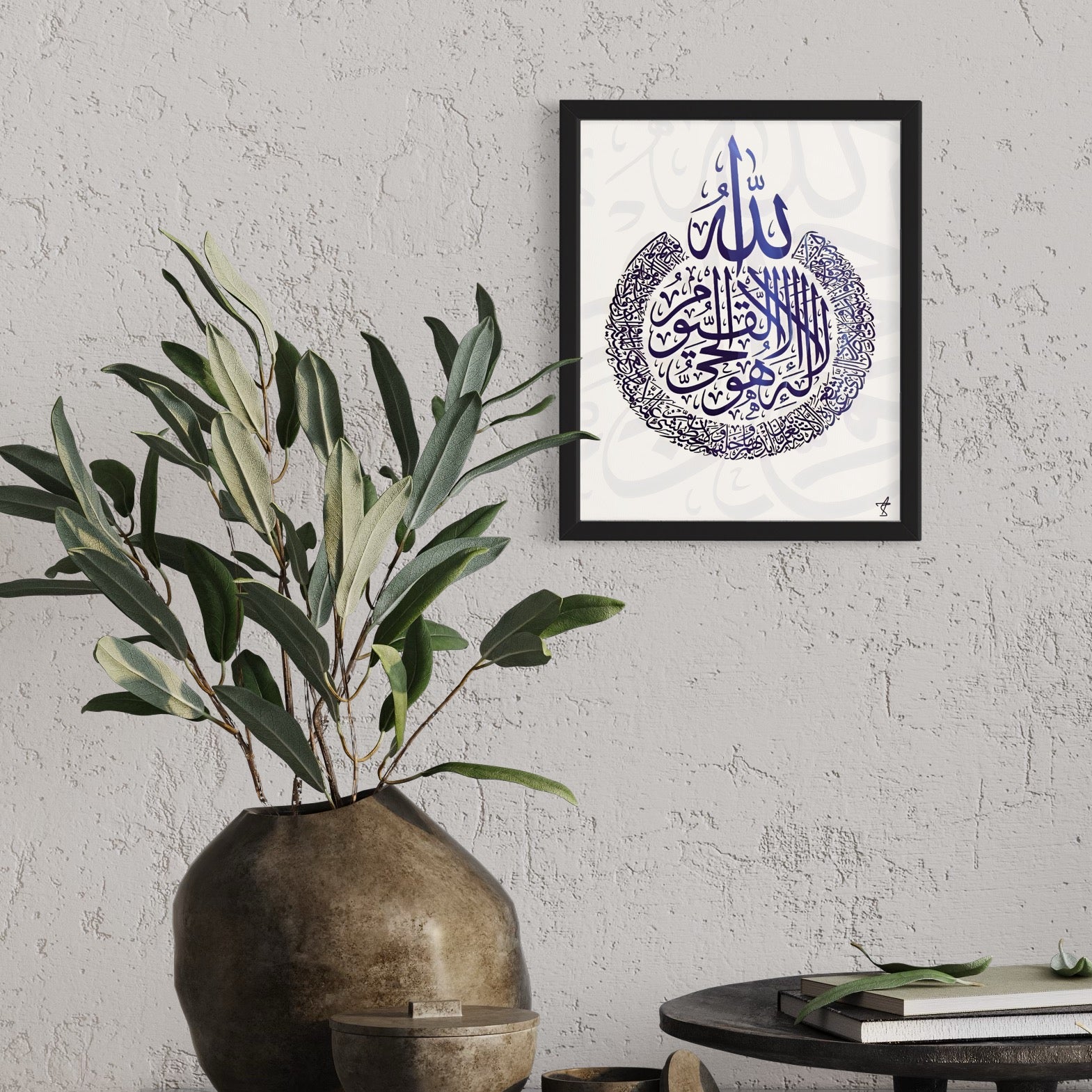 Title: Ayatul Kursi - The Throne - Arabic Calligraphy Blue On White Framed Print