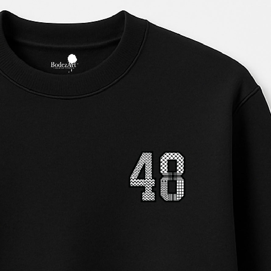 Representing the enduring identity and resistance of Palestine, symbolized through the number 48—marking the year of the Nakba in 1948—filled with the iconic black and white keffiyeh pattern, a powerful emblem of Palestinian heritage, struggle, and solidarity.