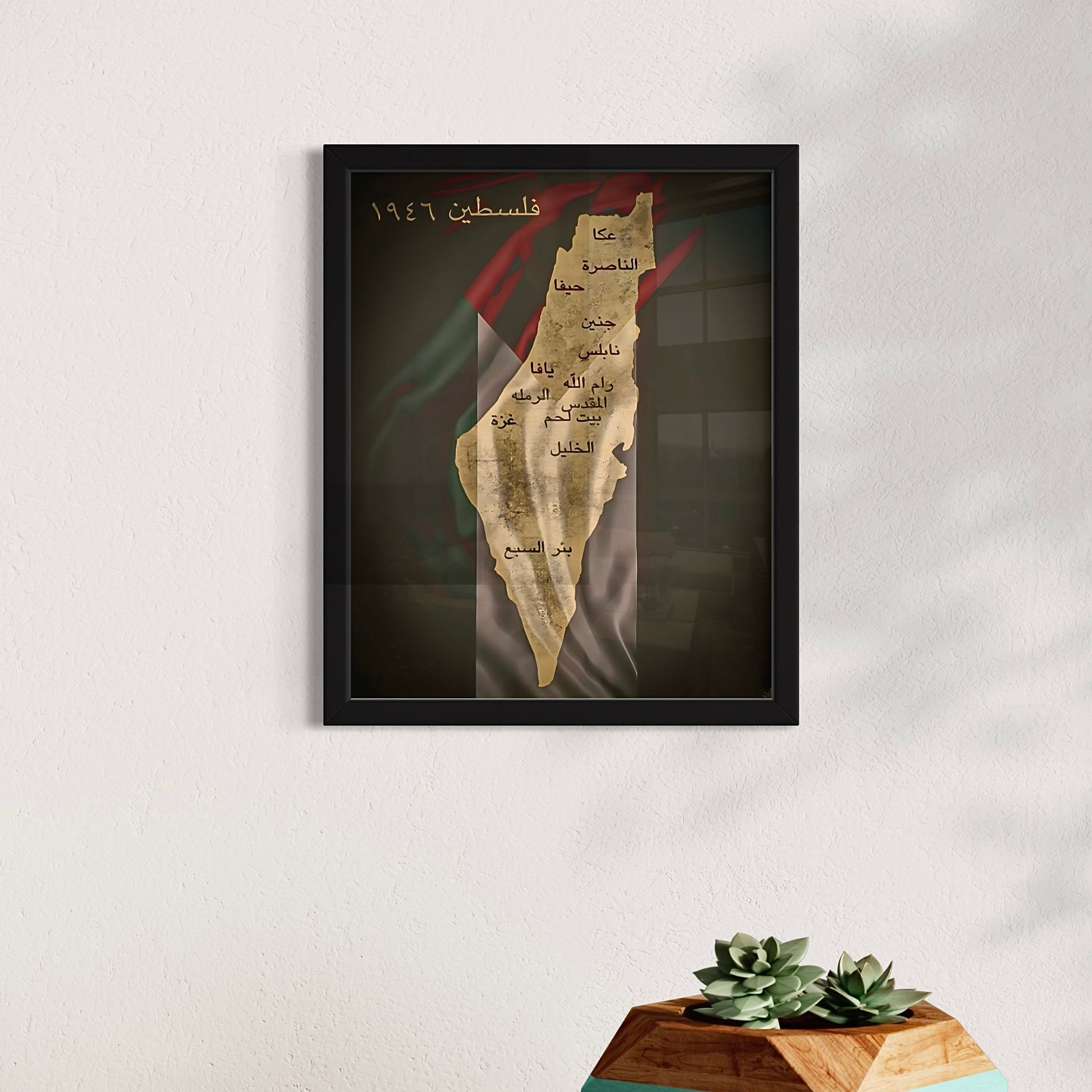 A hand drawn map with some of the Cities marked out in Arabic and finished with a digital overlay of the Palestinian flag.