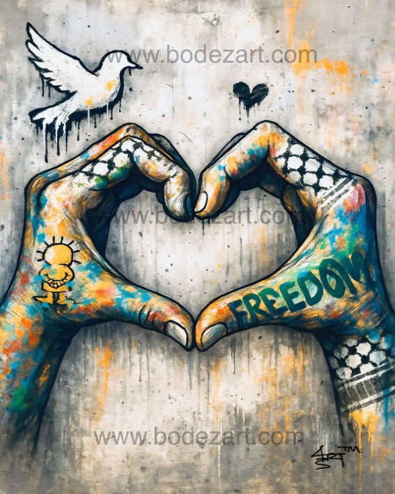 This piece carries a lot of emotional and symbolic weight — two hands form a heart, painted in layers of graffiti that speak of resistance, love, and identity. The single dove, dripping with paint, symbolises fragile peace and freedom taking flight, while Handala, subtly blended into the artwork, stands as a reminder of perseverance and the enduring struggle for hope.