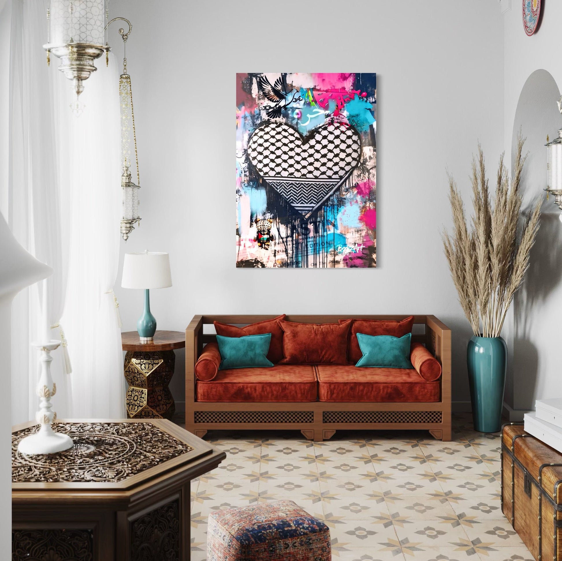 Free at Heart captures the enduring resilience and unity of the Palestinian spirit through the symbolic form of the keffiyeh heart. Layers of color, texture, and street art gestures merge to evoke both resistance and hope. The liberated dove and the Arabic word โุญุฑุฉโ (free) rise above the composition as emblems of unyielding freedom.