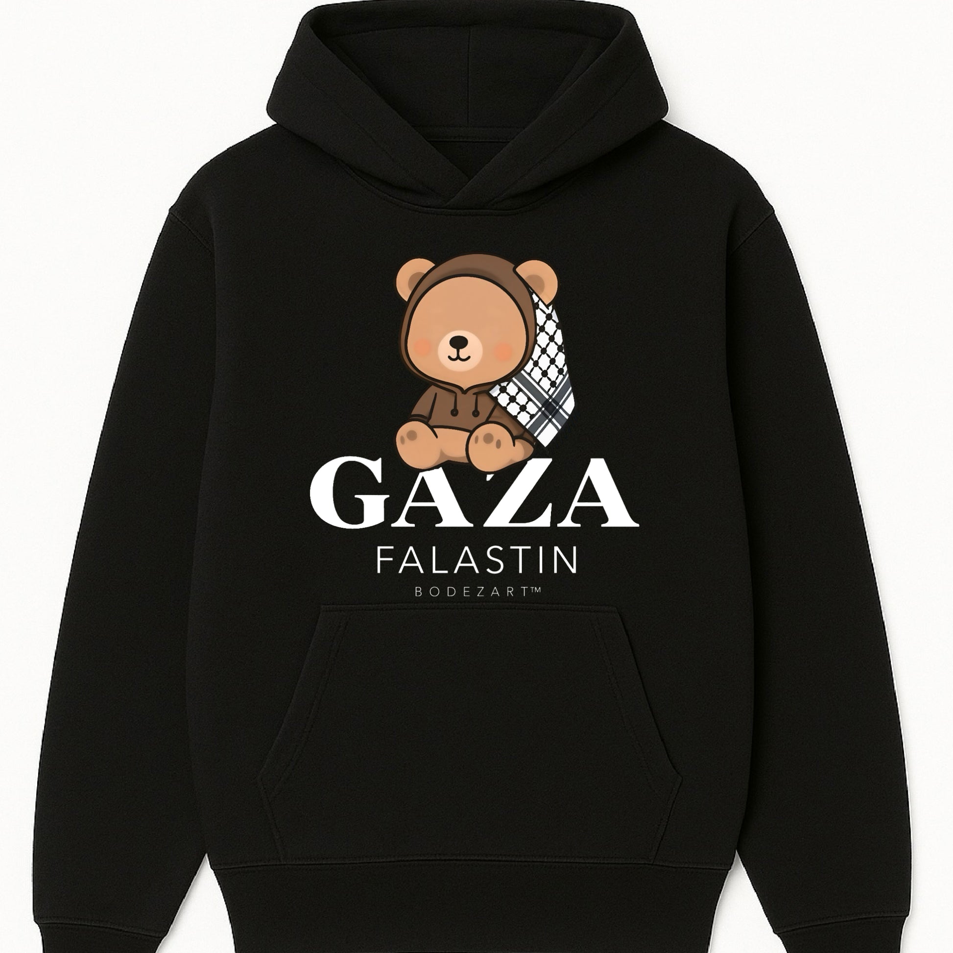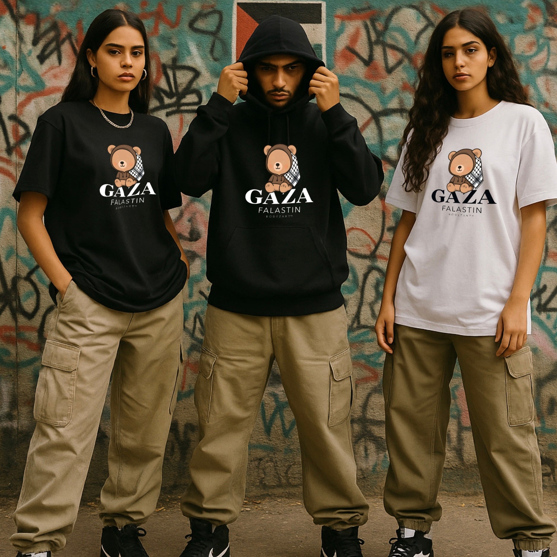 The bear symbolizes innocence, warmth, and resilience. It’s a gentle but powerful reminder that behind every headline, there are lives, dreams, and stories worth holding close. The keffiyeh connects the bear to a long-standing symbol of resistance and cultural pride, while the minimalist design ensures it resonates universally.
